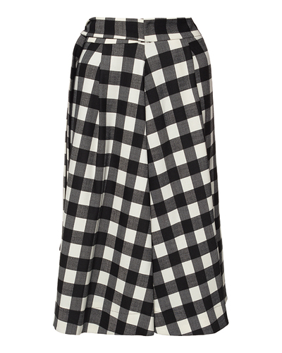 Юбка с добавлением шерсти в черно-белую клетку. Модель расклешенного силуэта с высокой посадкой на талии и застежкой на потайную молнию с завязками сбоку.