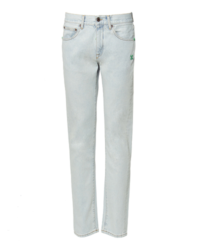Джинсы из плотного денима голубого оттенка. Модель прямого силуэта с комфортной посадкой на талии и застежкой на молнию и пуговицу. Изделие дополнено классическими пятью карманами и миниатюрной фирменной символикой бренда Off-White. Обратите внимание! Данное изделие маломерит, выбирайте на размер больше.