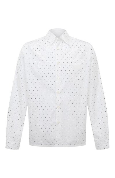 Миучча Прада разнообразила белую рубашку классического прямого кроя, украсив ее россыпью миниатюрных заклепок, создающих легкое мерцание. Для пошива модели использовали тонкий шелковистый хлопок. О принадлежности марке деликатно говорит узнаваемый треугольный элемент, которым дополнили накладной карман.
