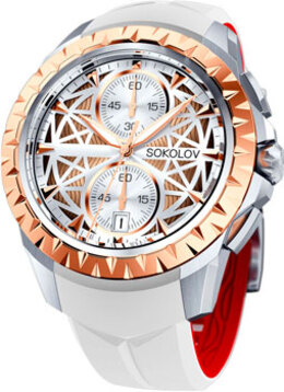 Кварцевый хронограф. Водостойкость WR 50. Часы, минуты, секунды. Индикация даты на позиции шести часов. Стрелки и метки с люминесцентным покрытием. Золотистый циферблат с часовыми индексами в виде штрихов. Корпус выполнен из нержавеющей стали с частичным PVD покрытием. Диаметр корпуса 41 мм, толщина 11 мм. Устойчивое к возникновению мелких механических повреждений минеральное стекло. Каучуковый ремешок белого цвета. Ширина ремешка 20 мм.