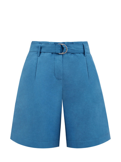 Элегантные женские шорты-клеш от Re Vera выполнены в небесно-синем оттенке. Легкая ткань из льняного и шелкового репса подчеркивает линии кроя и остается комфортной в летний сезон. Высокая посадка с заложенными складками от линии талии создает гармоничный силуэт. Детали: съемный пояс, шлевки для ремня, прорезные карманы, застежка на молнию.