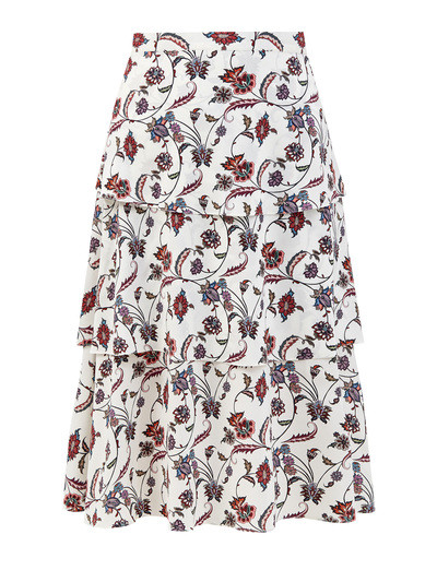 Легкая юбка-миди от Re Vera. Модель в молочно-белом оттенке выполнена из тонкого сатина на основе шелка и эластана, сочетание волокон придает материалу струящуюся фактуру. Многоярусный подол и цветочный паттерн подчеркивают расслабленный стиль изделия.