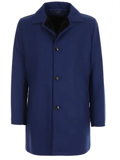 -Классическое пальто из синего кашемира с отделкой натуральным мехом бобра от KITON.