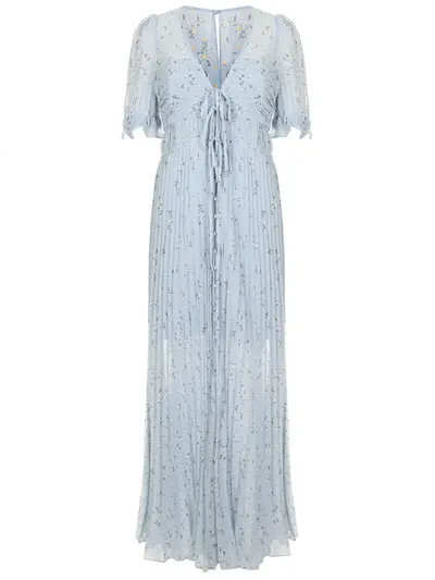 -Голубое с принтом платье-плиссе от SELF-PORTRAIT. -Приталенный крой длины макси, декор мелкими обтяжными пуговицами с воздушными петлями, V-образный вырез декольте с завязками, вышивка люрексной нитью по всему полотну.