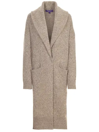 -Бежевый кардиган из мягкого кашемира от RALPH LAUREN. -Свободный силуэт-оверсайз, спущенная линия плеча, длинные рукава, рельефные манжеты и отделка низа изделия, широкий шалевый ворот.