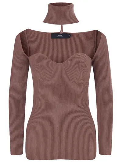 -Коричневый джемпер из мягкого кашемира с фактурной вязкой от ARCH4. -Облегающий силуэт, длинные рукава, вырез на груди, который обнажает плечи и подчеркивает грудь, высокий съемный воротник с отворотом, уравновешивающий смелый вырез декольте.