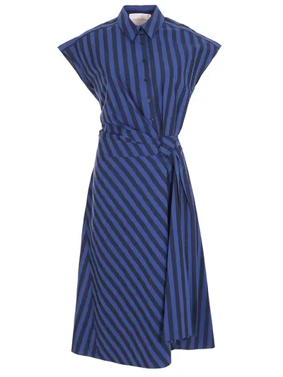 -Синее в полоску платье из хлопка от CAROLINA HERRERA. -Модель длины миди с отрезной талией, которая спереди оформлена драпировками и объемным декоративным узлом, расклешенная юбка, короткие рукава, отложной ворот и застежка на пуговицы.