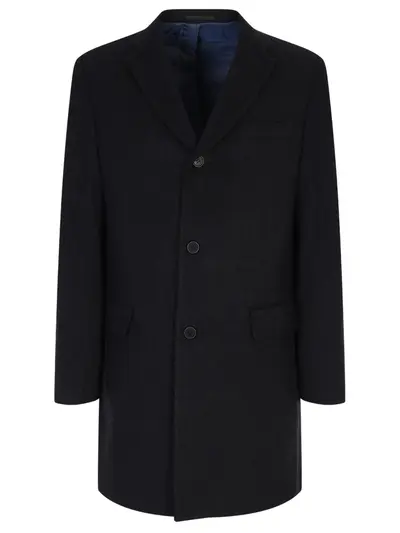 -Темно-синее классическое пальто из смесовой шерсти от CUDGI. -Прямой крой, длинные рукава, листочка, прорезные карманы с клапанами, лацканы и отложной ворот, высокая шлица сзади, застежка на пуговицы.