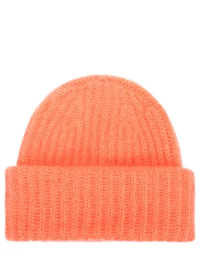 -Оранжевая вязаная шапка из пушистого смесового мохера от TAK.ORI. -Фактурная вязка, эластичная рельефная манжета-отворот, которая надежно фиксирует шапку на голове и не передавливает кожу.