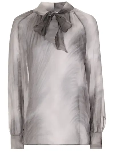 -Серая с принтом блуза из легкой прозрачной вискозы от ELENA MIRO. -Модель свободного кроя, длинные рукава-реглан, широкие манжеты, ворот-аскот с лентами-завязками.