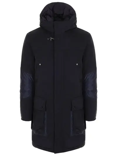 -Темно-синяя удлиненная куртка от FAY. -Прямой крой, воротник-стойка, переходящий в капюшон, длинные рукава, прорезные и крупные накладные карманы, застежка-молния и кнопки.