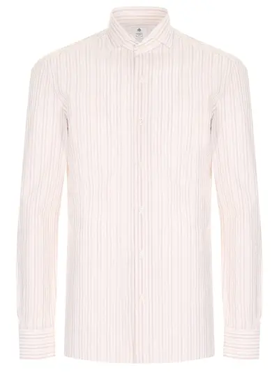 -Светло-бежевая рубашка из хлопка в вертикальную полоску от LUIGI BORRELLI. -Отложной воротник, длинные рукава с манжетами, застежка-пуговицы. -Модель Regular Fit.