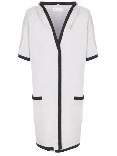 -Серый кардиган из кашемира от LE TRICOT PERUGIA. -Свободный силуэт, широкие рукава длины 1/2, рельефная обвязка пол, пояса и манжет, накладные карманы, капюшон, высокие боковые разрезы, контрастная окантовка деталей.