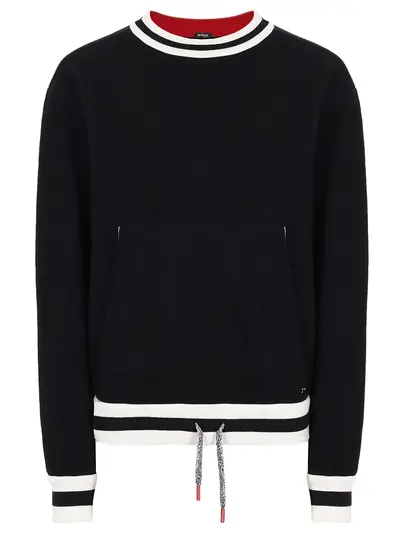 -Полуприлегающий силуэт, длинные рукава, эластичные манжеты, пояс и круглый вырез горловины с контрастной окантовкой, накладной карман спереди.