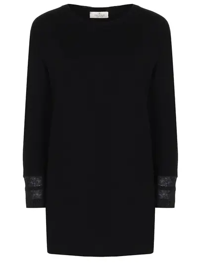 -Джемпер из шерсти черного цвета от PANICALE. -Модель свободного силуэта с боковыми разрезами, круглый вырез горловины, манжеты с отделкой люрексной нитью.