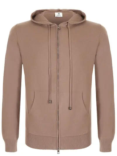 -Олимпийка с капюшоном из смесовой шерсти с добавлением кашемира в цвете кэмел от LUIGI BORRELLI. -Полуприлегающий крой, длинные рукава, эластичные рельефные манжеты и пояс, накладные карманы спереди, капюшон на кулиске, застежка-молния.