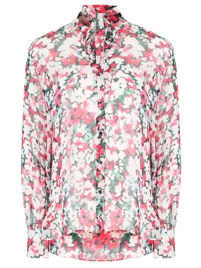 -Полупрозрачная блуза с цветочным принтом от HUGO. -Свободный крой, спущенная линия плеча, длинные рукава, манжеты, круглая горловина с лентами-завязками, застежка-пуговицы.