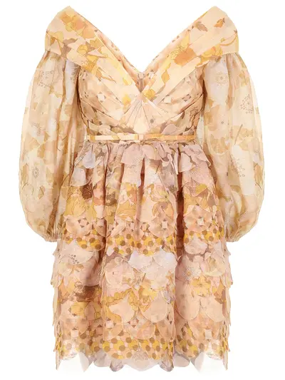 -Мини-платье из шелковой льняной органзы с принтом от ZIMMERMANN. -Модель с приталенным лифом со вставками и широким V-образным вырезом, мини-юбка с фестончатым подолом из деталей с лазерной резкой.