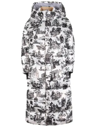-Удлиненный стеганый пуховик с принтом в черно-белых тонах от PHILIPP PLEIN.