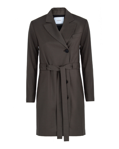 Платье Unlabel из шерсти коричневого оттенка. Модель длины мини скроено по типу удлиненного жакета с застежкой на пуговицы, отложным воротником и поясом из основного материала.