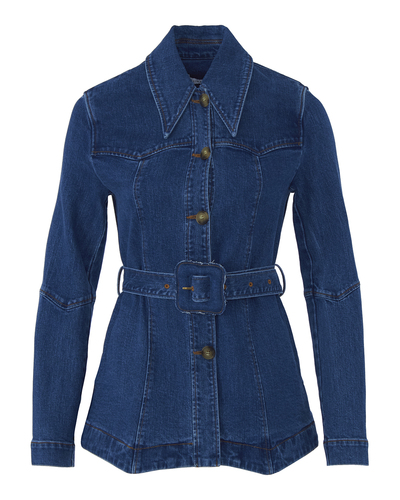 Жакет Rejina Pyo выполнен из плотного хлопкового денима синего оттенка. Модель приталенного силуэта с застежкой на черепаховые пуговицы дополнен поясом из основного материала с текстильной пряжкой.