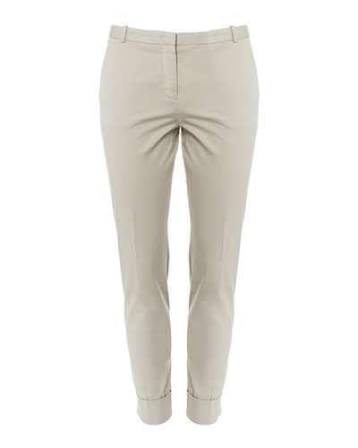 Брюки из эластичного хлопка бежевого оттенка. Укороченное изделие прилегающего силуэта с посадкой на бедрах, дополненное отворотами и двумя карманами.
