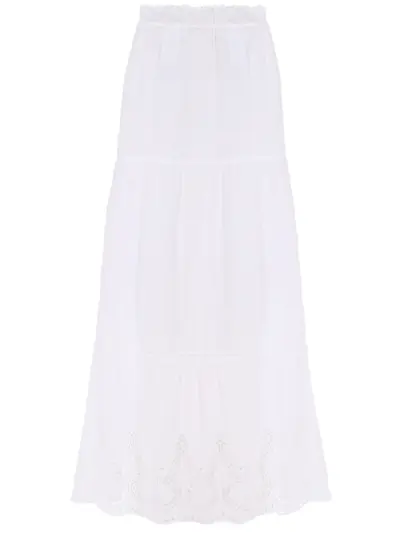 -Белая юбка-миди изо льна от 120% LINO. -Модель с легким клешем кроя, эластичный пояс для корректировки высоты посадки, ярусный крой, низ подола отделан шитьем.