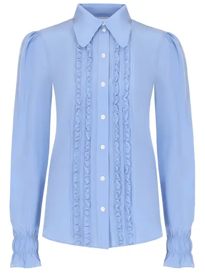 -Голубая блуза из шелка от VICTORIA BECKHAM. -Приталенный крой, длинные рукава с манжетами на резинке, отложной воротник, застежка-пуговицы, декор рюшами на груди.