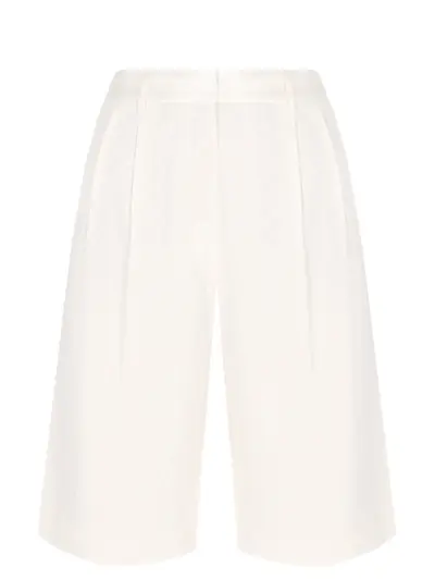 -Бермуды купажированного состава в кремовом цвете от KARL LAGERFELD. -Модель свободного кроя с высокой посадкой и линией талии, поясом со шлевками, защипами, прорезными карманами, застежкой на молнию и крючок.