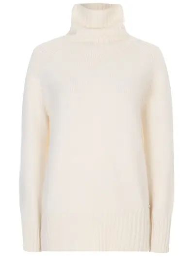 -Белый свитер из мягкой смесовой шерсти с добавлением кашемира от MANZONI24. -Полуприлегающий силуэт, длинные рукава, рельефные манжеты, пояс и высокий воротник, металлическая пластина с логотипом на бедре.