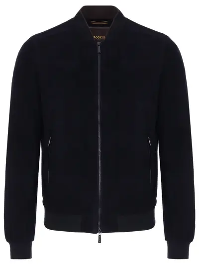-Бомбер из замши темно-синего цвета от MOORER. -Классический воротник, длинные рукава, эластичные манжеты и пояс по низу изделия, прорезные карманы на молнии, застежка-молния.