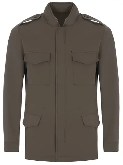 -Легкая куртка цвета хаки от BARBA. -Высокий ворот, застежка - молния, накладные и прорезные карманы с клапанами, длинные рукава, потайная кулиска на талии.