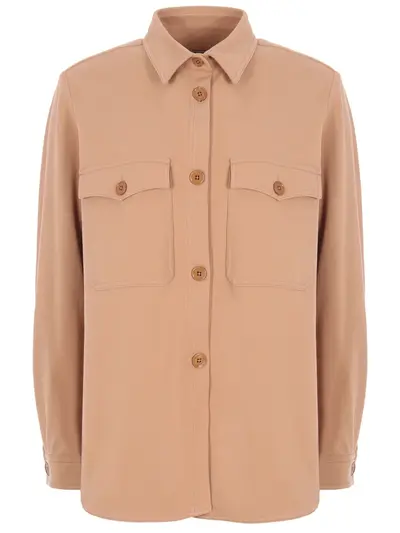 -Рубашка из плотного хлопка цвета беж от CIRCOLO 1901. -Полуприлегающий крой, длинные рукава, отложной воротник, крупные накладные карманы с клапанами, застежка-пуговицы.