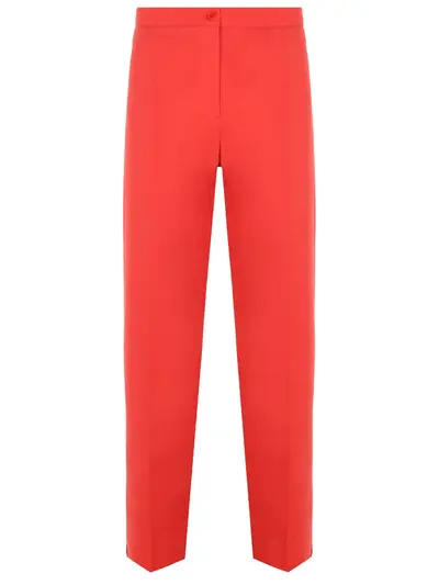 -Красные укороченные брюки от ELENA MIRO. -Прямой крой, средняя посадка, длина 7/8, пояс, прорезные карманы, застежка-молния и пуговица, графичные стрелки, которые визуально вытягивают силуэт.