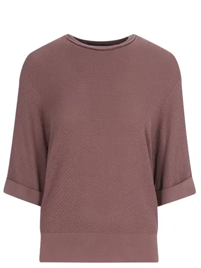 -Коричневый джемпер из фактурного шелка от FREE AGE. -Свободный силуэт, спущенная линия плеча, укороченные рукава длины 1/2 с отворотами, круглый вырез горловины.