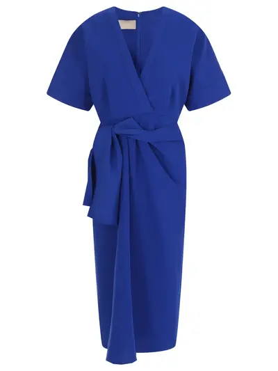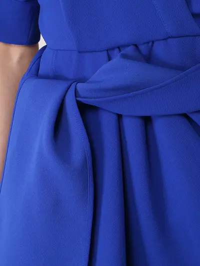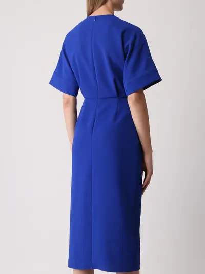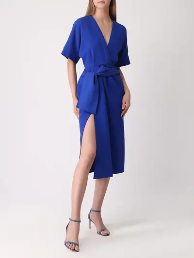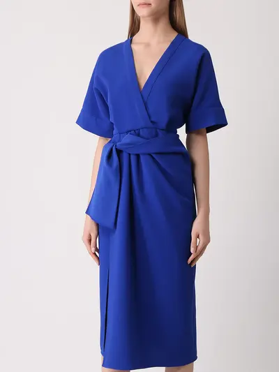 -Синее платье-миди от ELIE SAAB. -Модель с высокой отрезной талией, оригинальным поясом и драпировками спереди, короткими рукавами, V-образным запахом на груди и застежкой на потайную молнию сзади.