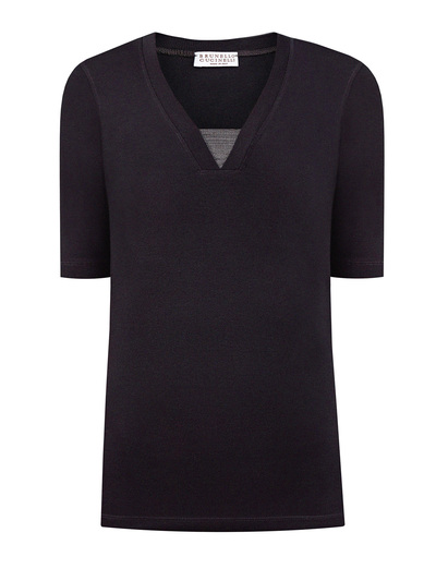 Элегантная женская футболка в черном цвете от Brunello Cucinelli выполнена из мягкого хлопка в рубчик. Дышащая ткань идеально подходит для создания повседневных образов, эластичные волокна в составе облегчают уход за изделием. Фирменный штрих — цепочка мерцающих бусин Мониль ручной огранки на V-образном вырезе. Детали: короткие рукава, удлиненный облегающий силуэт. Сделано в Италии.
