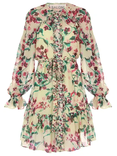 -Желтое с цветочным принтом мини-платье из шелка от SALONI. -Свободный крой, приталенный поясом в тон, длинные рукава с эластичными манжетами на резинке, круглый вырез горловины, отделка подола широкой оборкой, вертикальный декор рюшами.