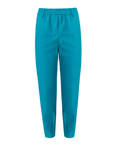 Брюки-бананы в оттенке морской волны выполнены зауженного к низу силуэта. Высокая посадка на талии и эластичная линия пояса дополнены двумя карманами по бокам.