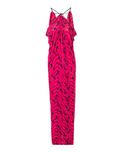Платье в пол PHILOSOPHY DI LORENZO SERAFINI сшили из эластичной принтованной вискозы розового оттенка. Модель с открытой спиной и завязками на спине.