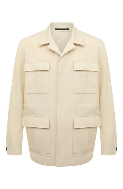 Кремовая куртка в стиле сафари – идеальный вариант для прохладных летних дней в городе. Для пошива модели с двумя парами больших накладных карманов мастера марки, основанной Пьетро Лоро Пьяна, использовали плотную хлопковую ткань с добавлением легкого дышащего льна, обработанного для дополнительной мягкости. Изделие с потайной кулиской на поясе застегивается пуговицами, скрытыми под широкой планкой.