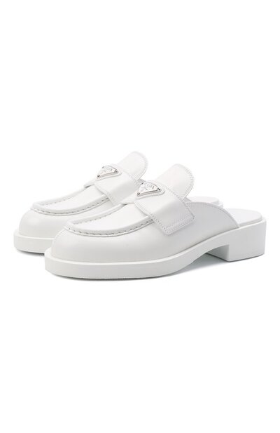 Белоснежные сабо с союзкой, как у лоферов, выполнили из гладкой мягкой кожи с деликатным блеском. На фигурной перемычке ‒ треугольная пластина, заявляющая о принадлежности бренду. Миучча Прада и Раф Симонс включили лаконичную модель с невысоким устойчивым каблуком в коллекцию сезона осень-зима.