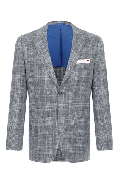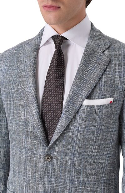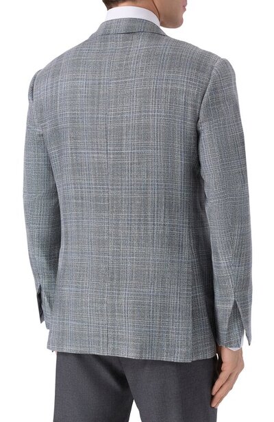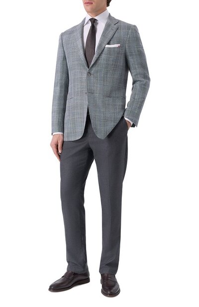 Легкая конструкция с полуподкладом и мягкая ткань — этот серый пиджак из весенне-летней коллекции 2022 года станет ярким примером итальянской портновской школы. Для пошива однобортной модели с широкими лацканами использовали мягкую полушерстяную ткань с добавлением гладкого шелка. Фактурное переплетение нитей создает неяркий клетчатый орнамент. Такое изделие будет уместно и днем в офисе, и вечером в театре.