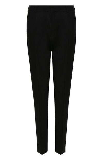 В классическую коллекцию марки, основанной Ивом Сен-Лораном, вошли черные зауженные брюки со стрелками и четырьмя карманами. Модель из тонкого шерстяного твила такого универсального цвета – удачное вложение в базовый гардероб: днем сочетайте его с рубашкой в тон, вечером – с ярким топом.