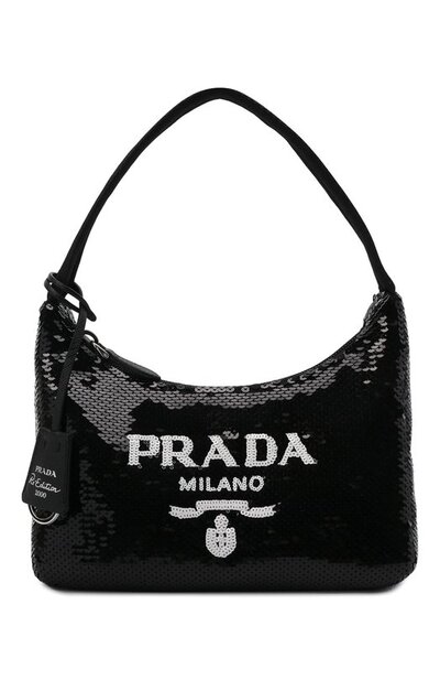 Черной сумке Re-Edition 2000 Миучча Прада придала деликатное сияние. Дизайнер полностью украсила аксессуар миниатюрными пайетками в тон, а логотип бренда выделила контрастным цветом. Мастера марки бережно нашили каждую деталь на шелковистый знаковый нейлон, который создают из переработанных нитей. В изделие с короткой ручкой поместятся смартфон, кошелек, ключи и помада.
