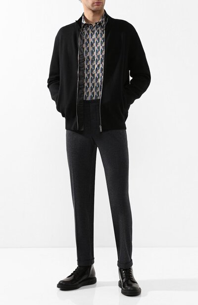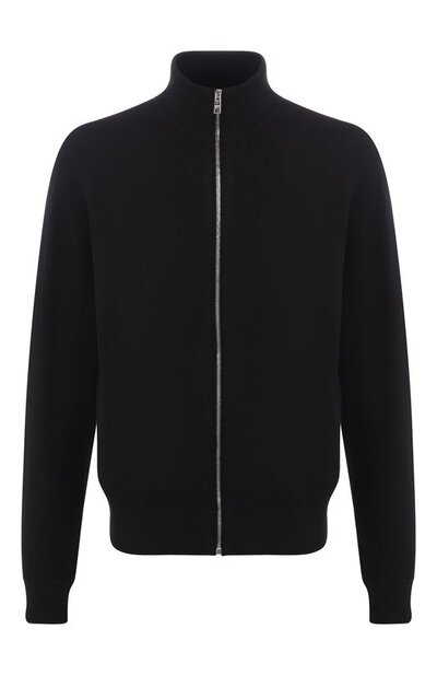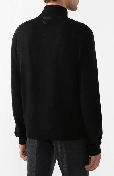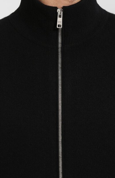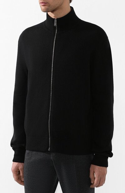 В коллекцию сезона осень-зима Миучча Прада включила прямой черный кардиган с высоким воротником-стойкой. Модель изготовили из мягкого кашемира. Такой материал теплее, легче и долговечнее обычной шерсти, а на ощупь – гораздо нежнее и приятнее. Благодаря минимуму декора (только небольшая эмблема марки на спинке) такая вещь не будет противоречить офисному образу в стиле free friday.