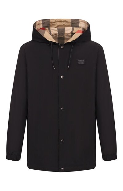 Куртку с капюшоном можно носить наружу стороной в клетку Burberry Check или однотонной, украшенной прорезиненным брендированным патчем. Двустороннюю модель с парными боковыми карманами и регулируемыми эластичными манжетами изготовили из полиэстеровой тафты.
