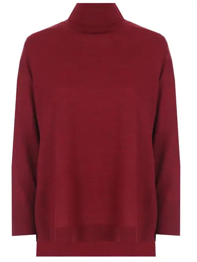 -Бордовый свитер из тонкой шерсти от TONET. -Модель свободного силуэта с длинными рукавами, спущенной линией плеча, широкими рельефными манжетами, поясом с боковыми разрезами и высоким воротником с отворотом.