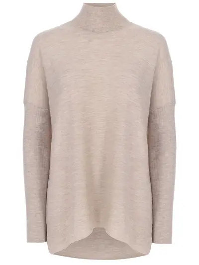 -Бежевый свитер из тонкого кашемира от GENTRYPORTOFINO. -Свободный силуэт, спущенная линия плеча, длинные рельефные рукава и высокий облегающий воротник.