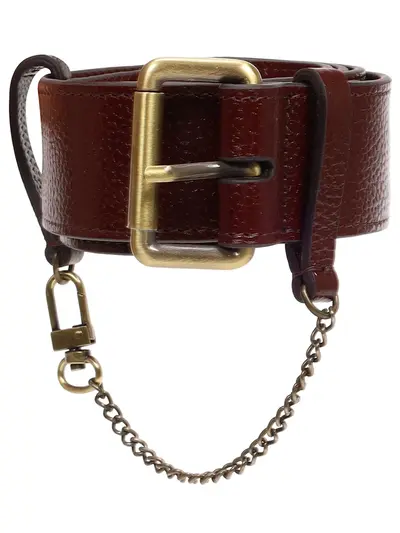 -Ремень из мягкой мелкозернистой кожи бордового цвета от LAROOM. -Модель с матовой пряжкой под бронзу, две шлевки, соединенные между собой цепочкой на карабине.